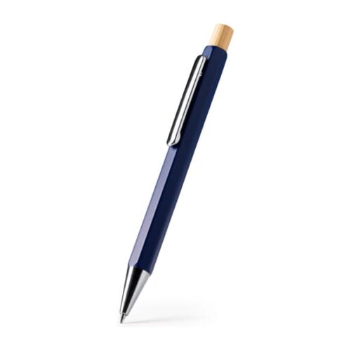 Kuusikulmainen kuulakärkikynä, jossa metallinen runko ja bambuinen painike. Kromattu klipsi. Jumbo-täyttöpakkaus sinisellä musteella.