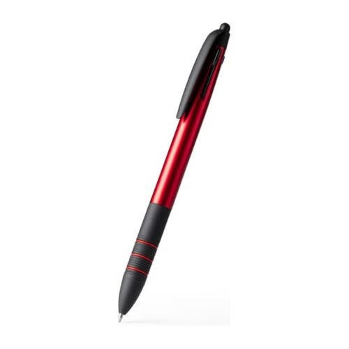 Sisäänvedettävä kolmiosainen kuulakärkikynä. Runko ABS-muovia, mustat yksityiskohdat ja pehmeä otepinta. Kosketusosoitin. Sininen, musta ja punainen muste.