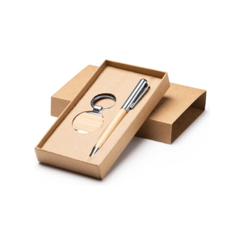 Bambuinen kuulakärkikynä ja avaimenperäsetti, jossa metalliset yksityiskohdat. Sininen muste. Pakattu ekologiseen koteloon.