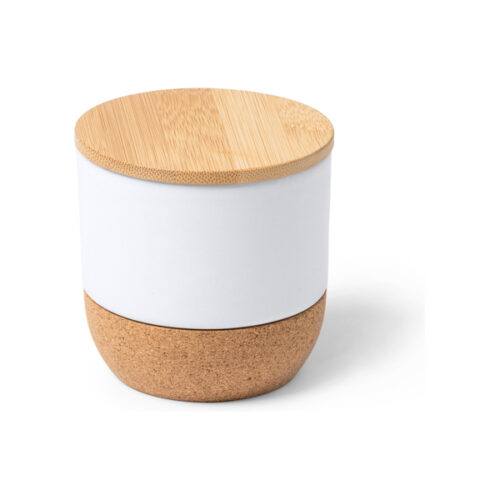 Tuoksukynttilä keraamisella astialla, korkkijalustalla ja bambukannella. Kasvivahaa vaniljan aromilla. Pakattu ekologiseen rasiaan.