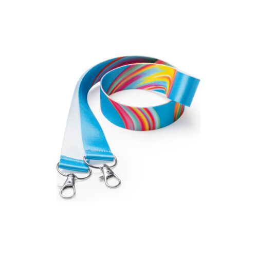 Kaksinkertainen polyesteristä valmistettu kaulanauha karbiinihaalla, erityisesti sublimaatioon. Tämä on tilauksesta valmistettu tuote.
