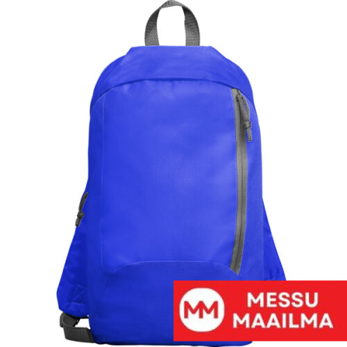 Pieni reppu säädettävillä olkahihnoilla. 1. – Yläkahva ripustamista varten. 2. – Etutasku pystysuoralla vetoketjulla. Kevyt ja kompakti.