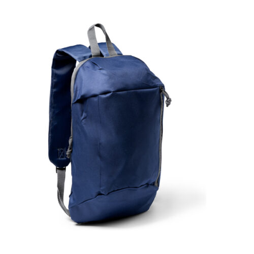 Pieni reppu säädettävillä olkahihnoilla. 1. – Yläkahva ripustamista varten. 2. – Etutasku pystysuoralla vetoketjulla. Kevyt ja kompakti.