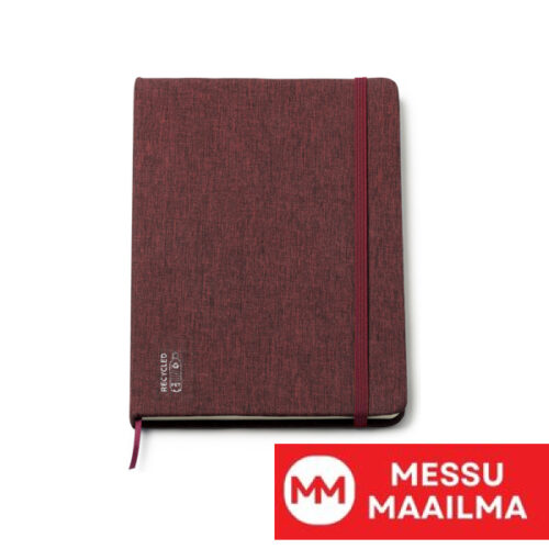 A5-kokoinen muistikirja kovakantisilla RPET-kanneilla. Mukana yhteensopiva kirjanmerkki ja kuminauha. 80 sivua.