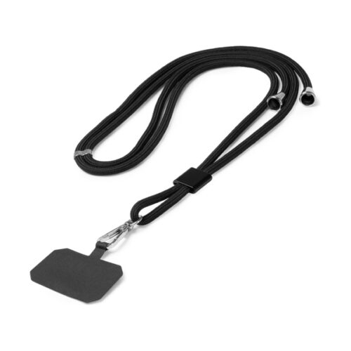 Kierrätetystä RPET-polyesteristä valmistettu kännykkäpidike. Säädettävä hihna ja mukana karabiinihaka.