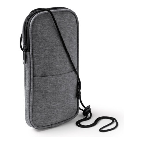 Kännykkätasku RPET-polyesteriä. Päälokerossa yhteensopiva vetoketjukiinnitys. Ulkotasku. Mukana yhteensopiva kantohihna.