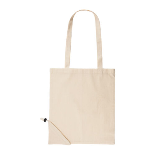 Taittuva ostoskassi, joka on valmistettu 100 % 105 g/m² puuvillasta, 70 cm pitkillä kahvoilla ja säädettävällä, taittuvalla kiristysnyörillä suljettavalla pussilla.