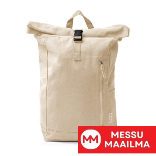 Kierrätetystä puuvillasta valmistettu reppu, paino 370 g/m². Suuri päälokero, jossa vetoketjulla ja säätömahdollisuudella varustettu aukko. Etutasku vetoketjulla ja sivutasku. Tilavuus: 25 litraa.