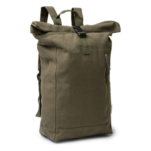 Kierrätetystä puuvillasta valmistettu reppu, paino 370 g/m². Suuri päälokero, jossa vetoketjulla ja säätömahdollisuudella varustettu aukko. Etutasku vetoketjulla ja sivutasku. Tilavuus: 25 litraa.