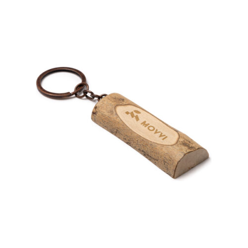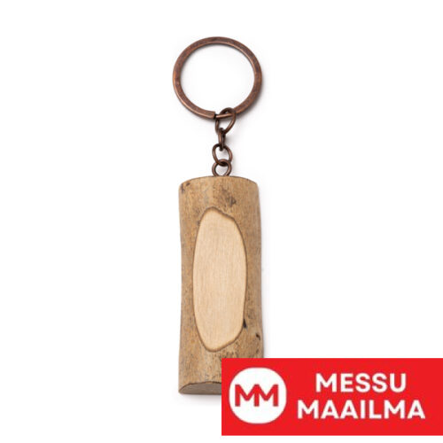Puinen avaimenperä, jossa syvennys ja metallirengas.