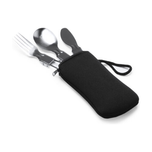 Ruostumattomasta teräksestä valmistettu kokoontaitettava aterinsetti käytännöllisessä neopreenikotelossa. Sisältää haarukan, veitsen ja lusikan.