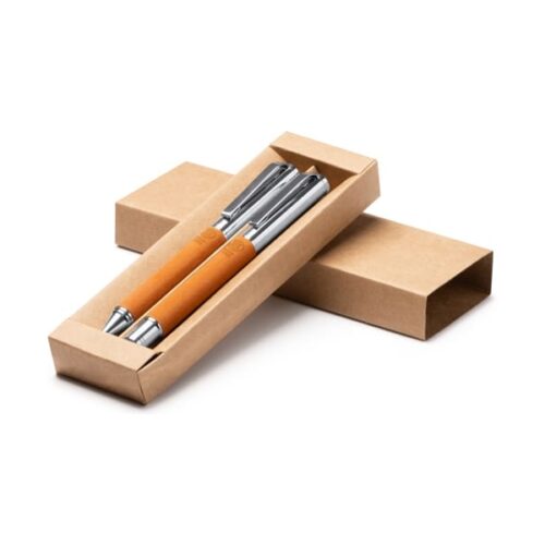 Kuulakärki- ja rullakynäsetti, jossa kierrätetystä nahasta valmistettu runko, kierremekanismi ja metalliset yksityiskohdat. Sininen muste.