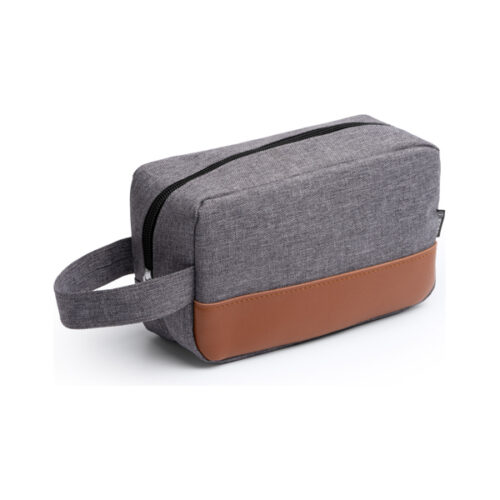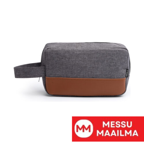 Kierrätetystä RPET-polyesteristä ja PU-nahasta valmistettu meikkilaukku, jossa kantokahva.