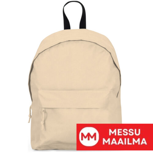 Perusreppu kestävästä kankaasta. 1. Kaksinkertainen olkahihna ja kontrastivärinen kantokahva. 2. Kaksi taskua: päätasku ja yksi etutasku, jossa on yhteensopivat vetoketjut, läpät ja vetimet.