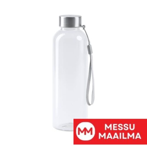 Läpikuultava RPET-pullo. Tilavuus 600 ml. Mukana kantohihna. Pullo, jossa on erilainen muotoilu, joka on huomioinut ympäristön huomioimisen.