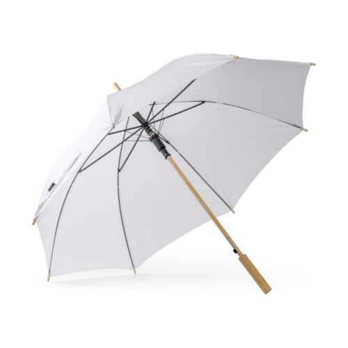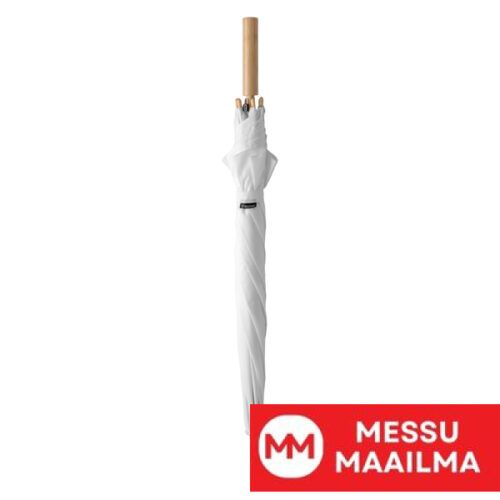 Sateenvarjo, jonka kahva, rakenne ja yksityiskohdat ovat bambua. Automaattisesti avautuva. 190T tuulenpitävää RPET-pongee-kangasta.