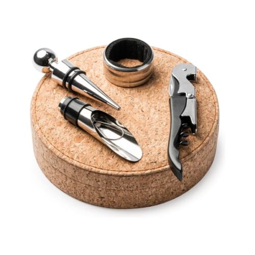 Viinisarja ruostumattomasta teräksestä valmistetuilla varusteilla: pulltap-korkkiruuvi kaksoisvivulla ja taittuvalla terällä, tipparengas, kaatonokka ja tulppa.