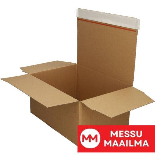 Joustava pakkauslaatikko, jossa on nopea pohja, suljinliuska ja repäisyaukko.