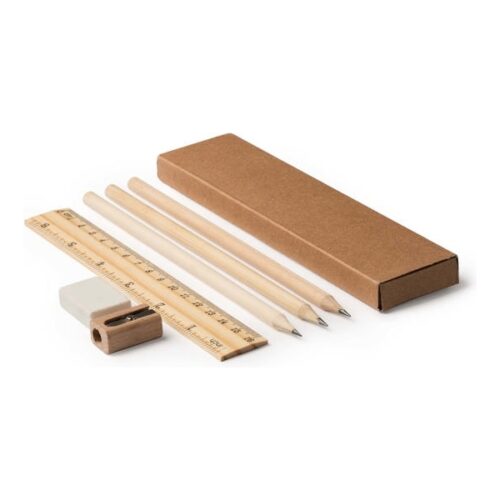 Luonnonpuusta valmistettu kirjoitussarja pahvikotelossa. Mukana viivain, 3 lyijykynää, 1 kumi ja 1 teroitin.