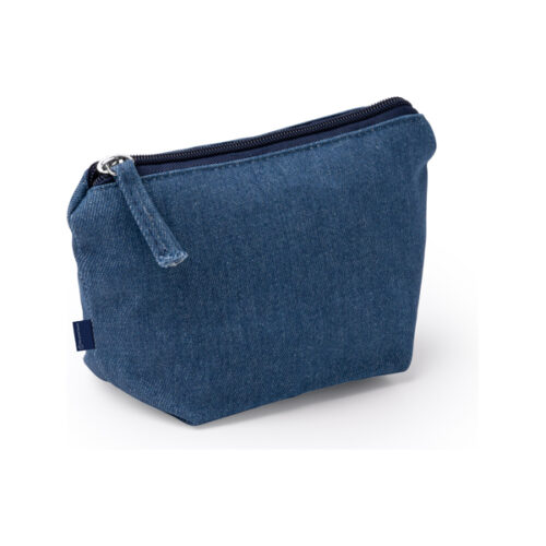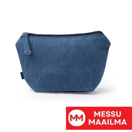 Kierrätetystä denimistä valmistettu meikkilaukku, jossa on yhteensopiva vetoketjukiinnitys.