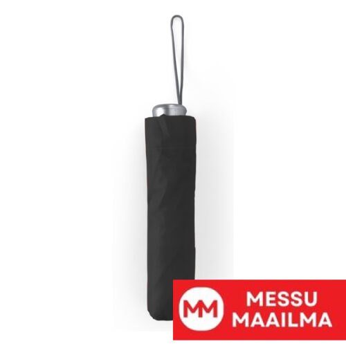 Taittuva sateenvarjo ja siihen sopiva pussi. Hopeinen kahva, kaaret ja kärjet. Tarranauhakiinnitys ja manuaalinen avaus. Halkaisija 95 cm.