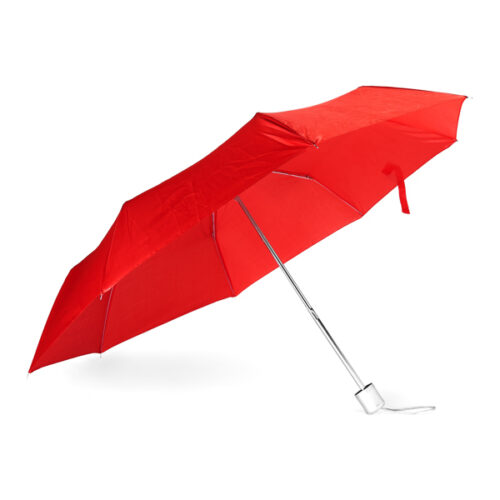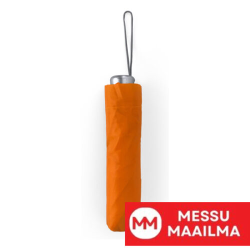 Taittuva sateenvarjo ja siihen sopiva pussi. Hopeinen kahva, kaaret ja kärjet. Tarranauhakiinnitys ja manuaalinen avaus. Halkaisija 95 cm.
