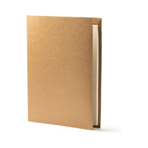 Kierrätetystä pahvista valmistettu kansio. Irrotettava 20 arkin selkeä muistivihko, yhteensopiva vehnäkuidusta valmistettu kynä, sisätasku ja korttikotelo.