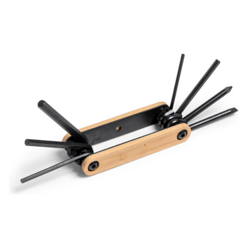 Monitoimityökalu ruostumattomasta teräksestä valmistetuilla lisävarusteilla. Pakattu ekologiseen laatikkoon.